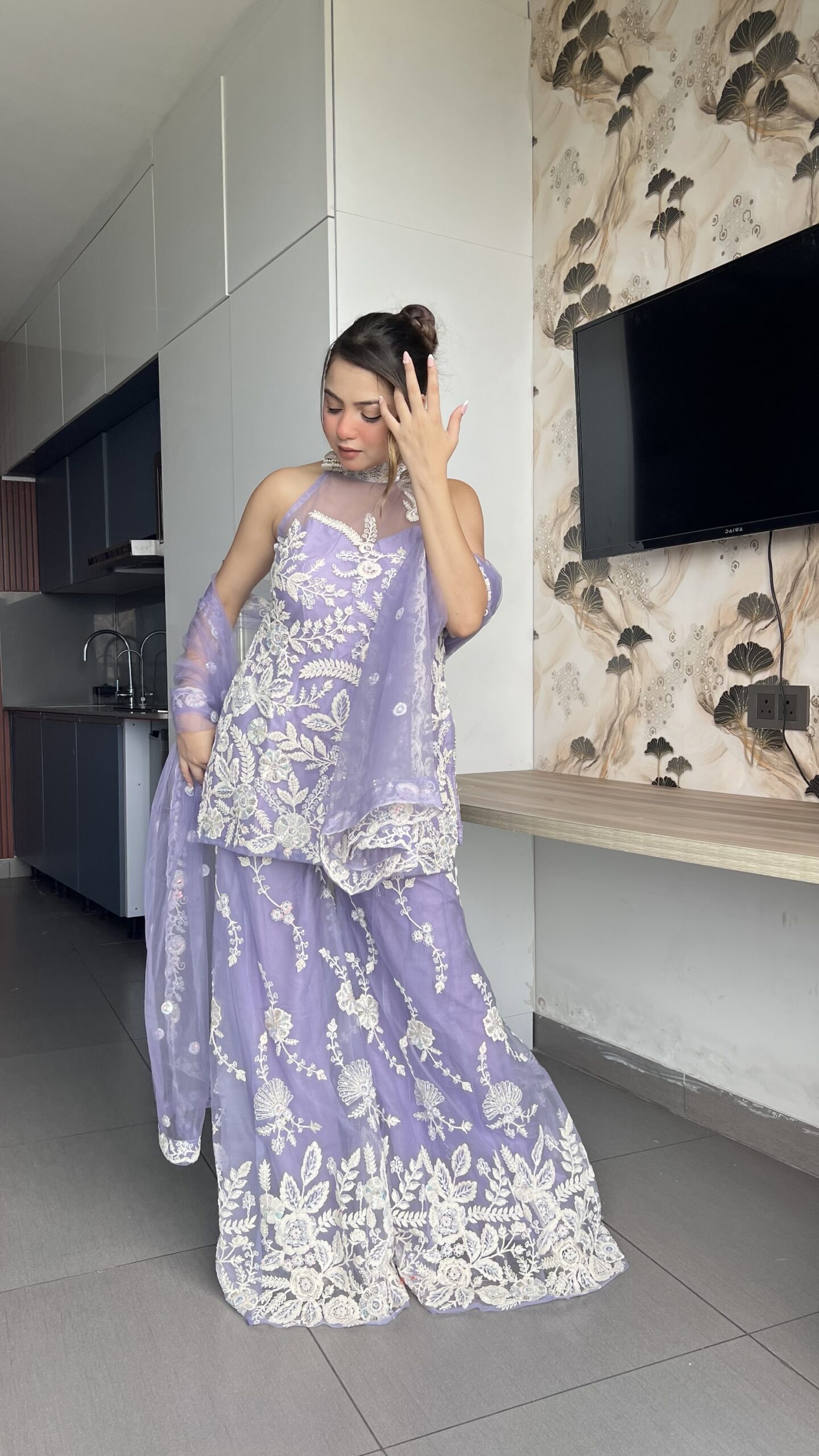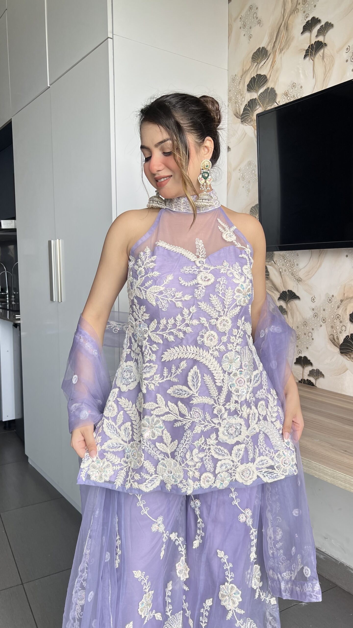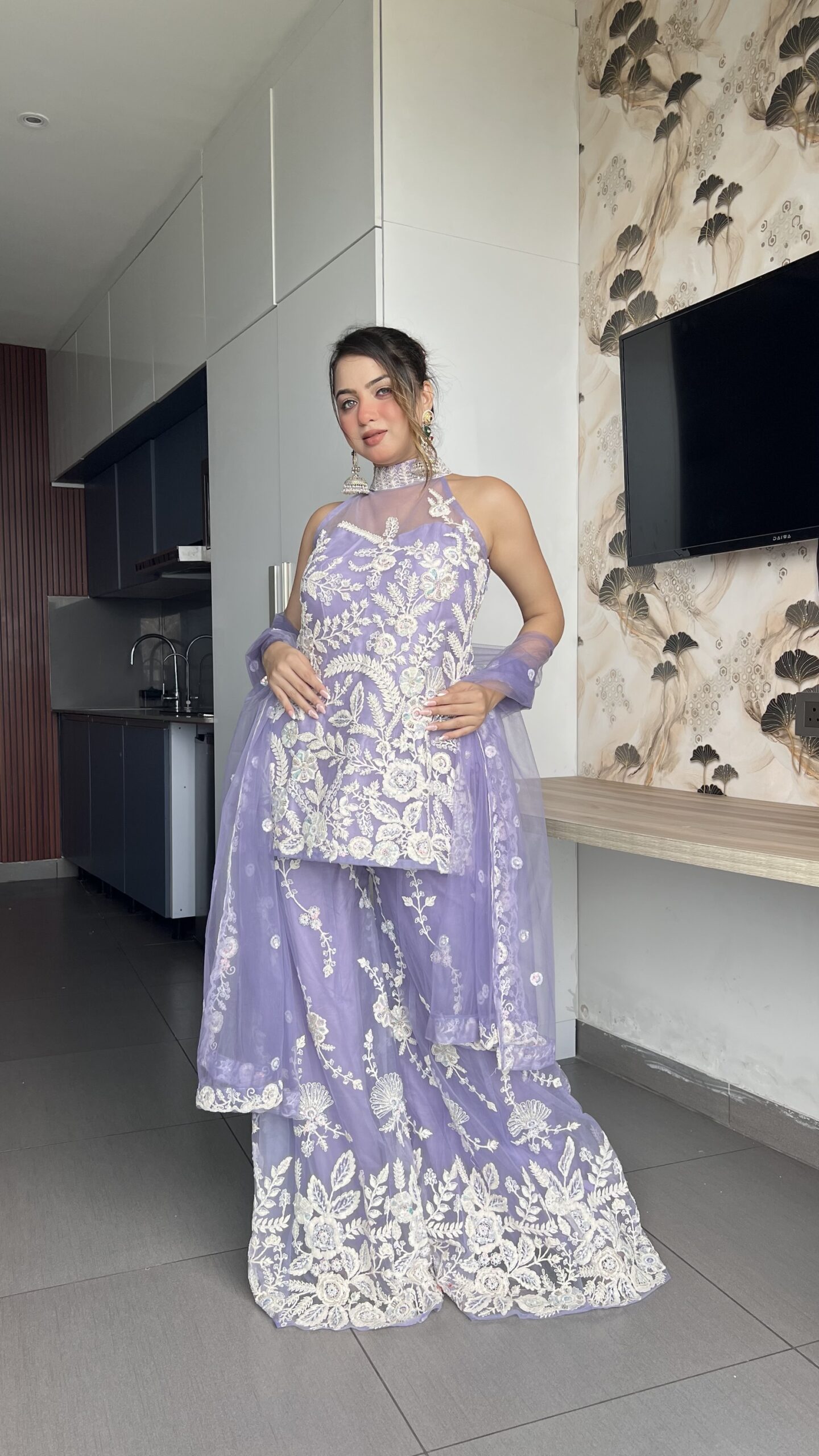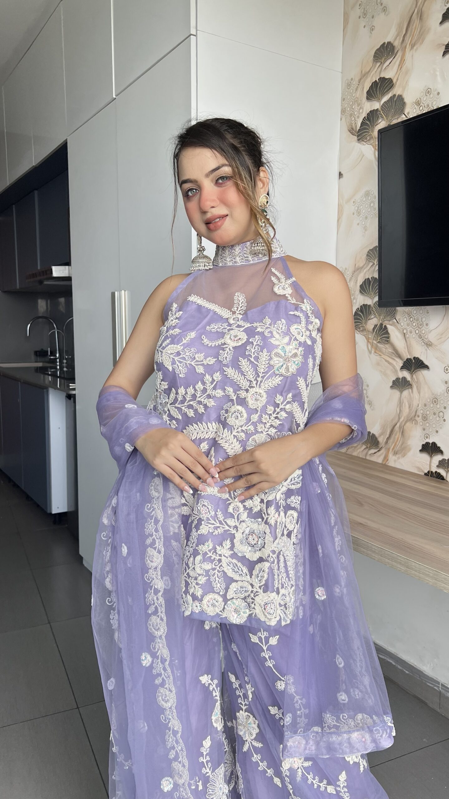 Step into elegance with this stunning lavender sharara suit, beautifully adorned with delicate white floral embroidery. The halter-style kurta paired with flowy sharara pants and a sheer dupatta makes it the perfect blend of tradition and modern charm. Ideal for weddings, festive occasions, or evening celebrations.