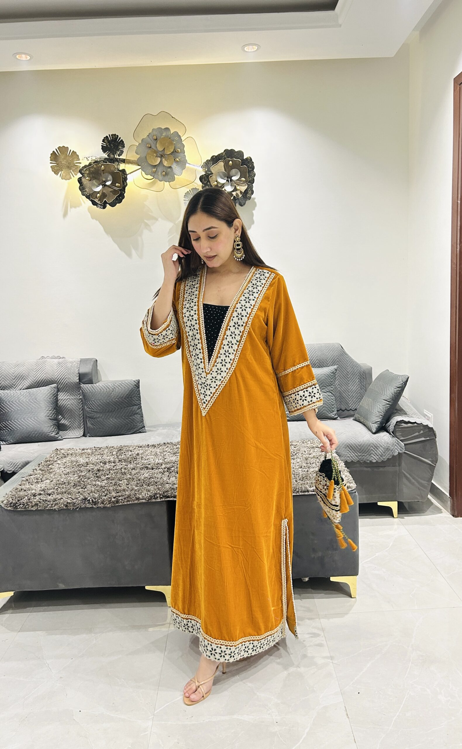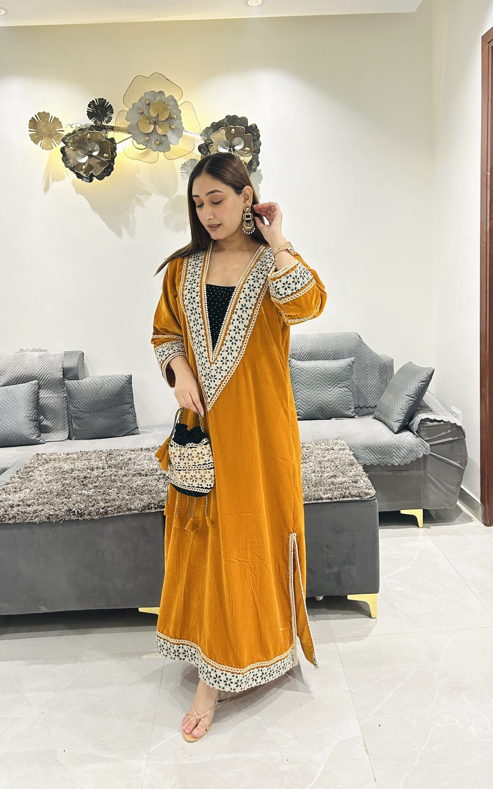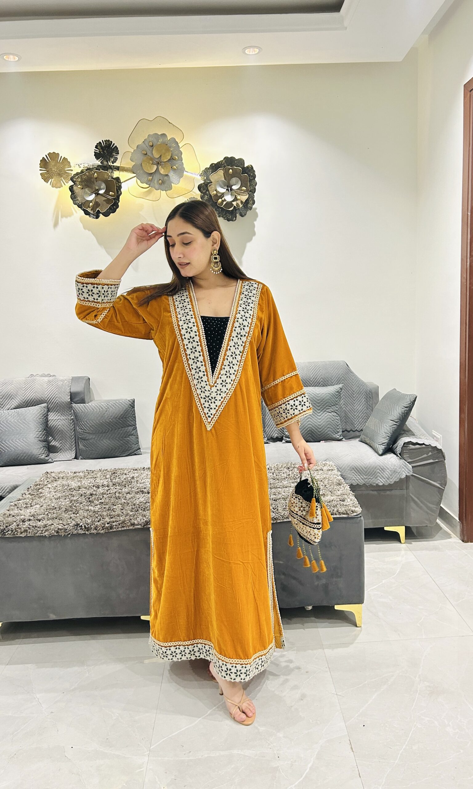 A warm mustard velvet kurta that brings together tradition and modern flair.