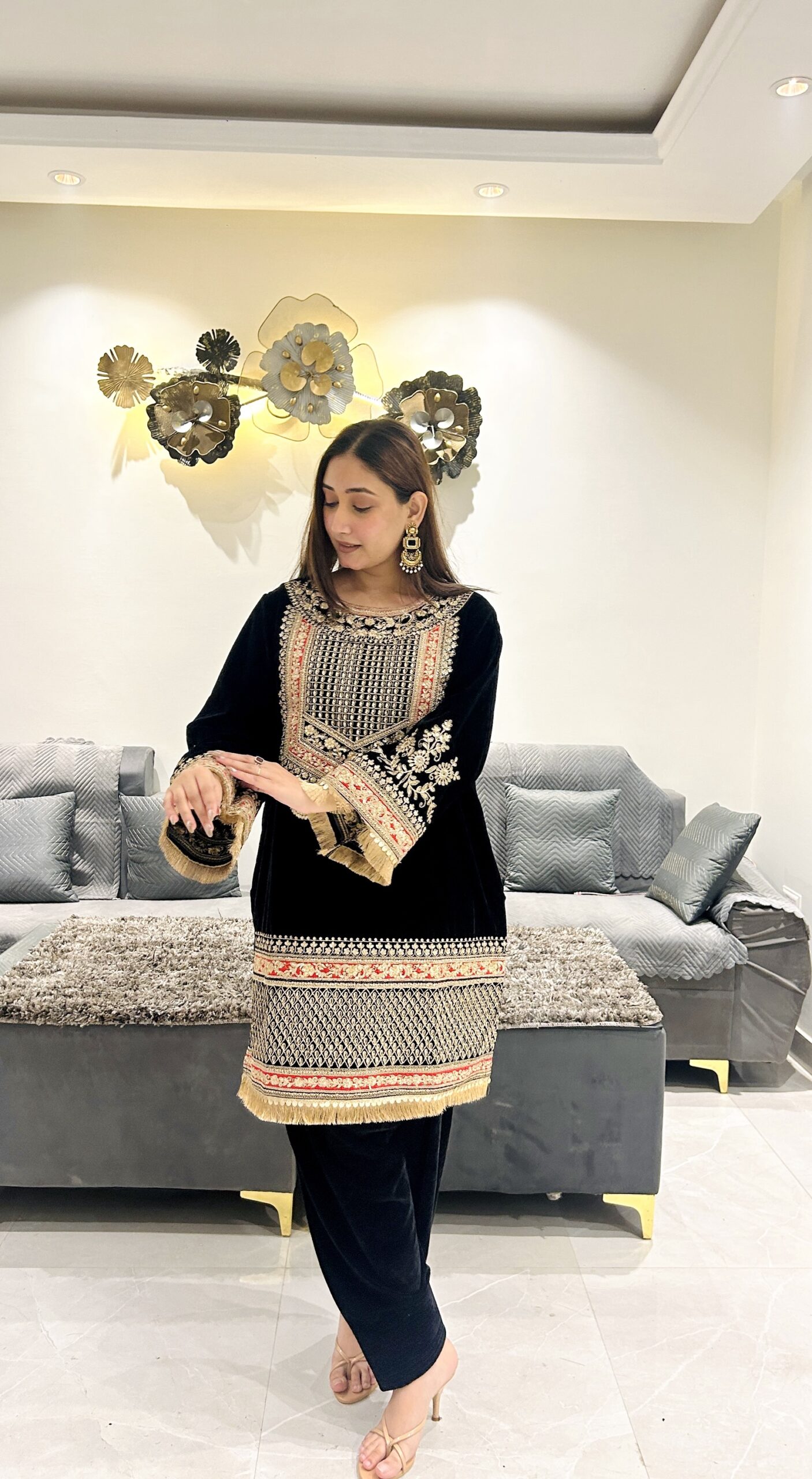 This stunning black velvet kurta set is crafted for those who love timeless elegance with a regal touch.